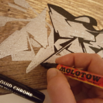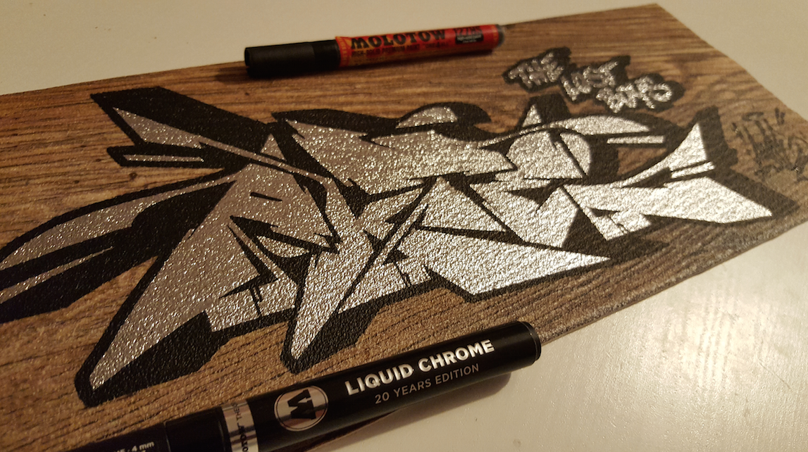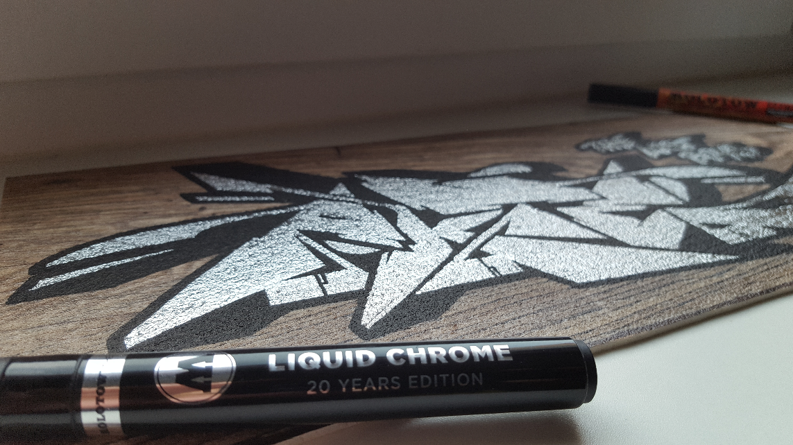 After graffiti artist MATE ONE painting a sketch with MOLOTOW ONE4ALL and the brandnew MOLOTOW LIQUID CHROME Marker here is another nice one this time on a piece of wood by berlin based graffiti artist AKTE ONE! Jump to see the photos!