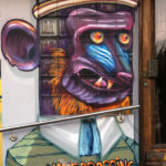 That’s what I love about painting: to exchange ideas at the spot, to let the room take effect on you and to work with it. We consciously incorporated as much of the original wall as possible. Hopefully you can still see that the glass blocks in the hairstyle of the monkey standing in the centre of the wall, are unpainted.