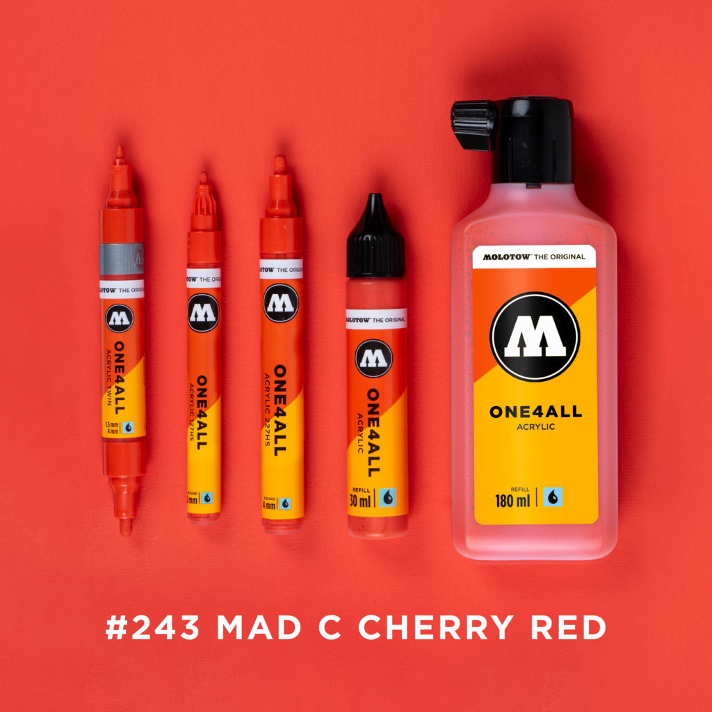 Todays COLOR OF THE WEEK is the MOLOTOW ONE4ALL Acrylic Paint #243 MadC Cherry Red, a vibrant and rich red color named after the deep red color of ripe cherries. It’s not quite as bright as a true red, but it also isn’t as dark as a maroon. This makes it a very versatile color that can be used for a variety of purposes. The color is named after one of our close friends and great artist MAD C. We´ve asked her why she picked this color to be named after her artist name: