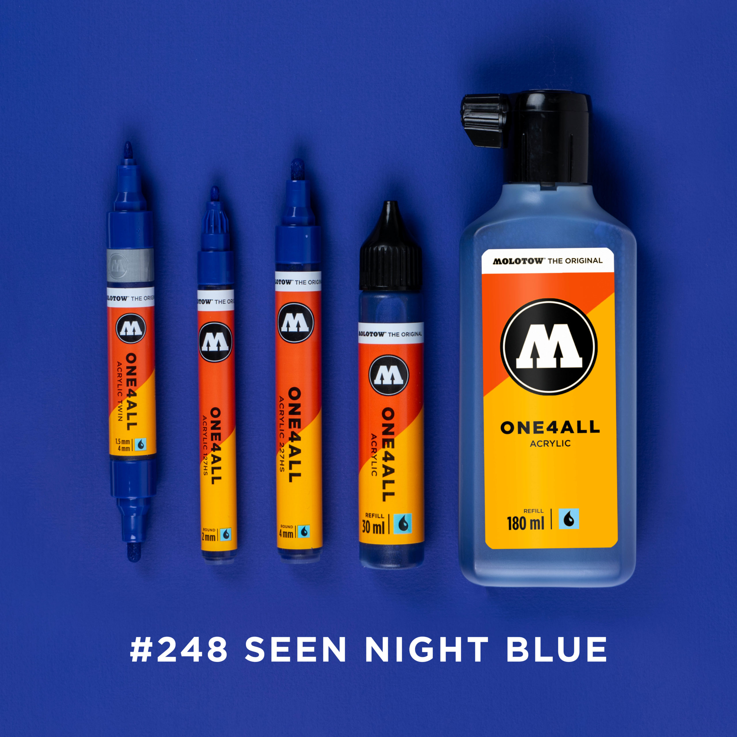 Todays COLOR OF THE WEEK is the MOLOTOW ONE4ALL Acrylic Paint #249 ULTRAMARINE, a stunning deep blue color, often described as a “true blue.” with a vivid blue shade, not quite as dark as navy but possessing a deeper intensity than a sky blue. ULTRAMARINE has a strong, clear quality, making it appear bright and almost luminous, traditionally, this color came from grinding a semi-precious stone called lapis lazuli into a powder.