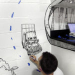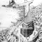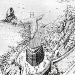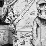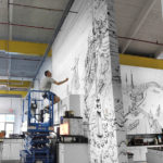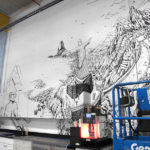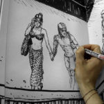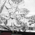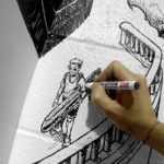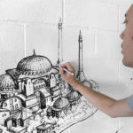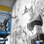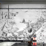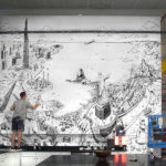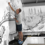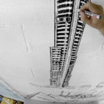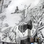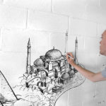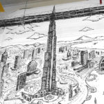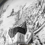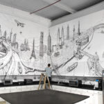 “It represents the continuity of a fantasy world, in which you can recognise famous parts of the world in one city : the Corcovado, the Machu Picchu, the Burj Dubai, the pyramids of Egypt, Hagia Sophia in Istanbul, etc.I drew this freehand using Molotow One4All markers and refill. I didn’t use so many markers thanks to the exchangeable tips which I used a lot!”