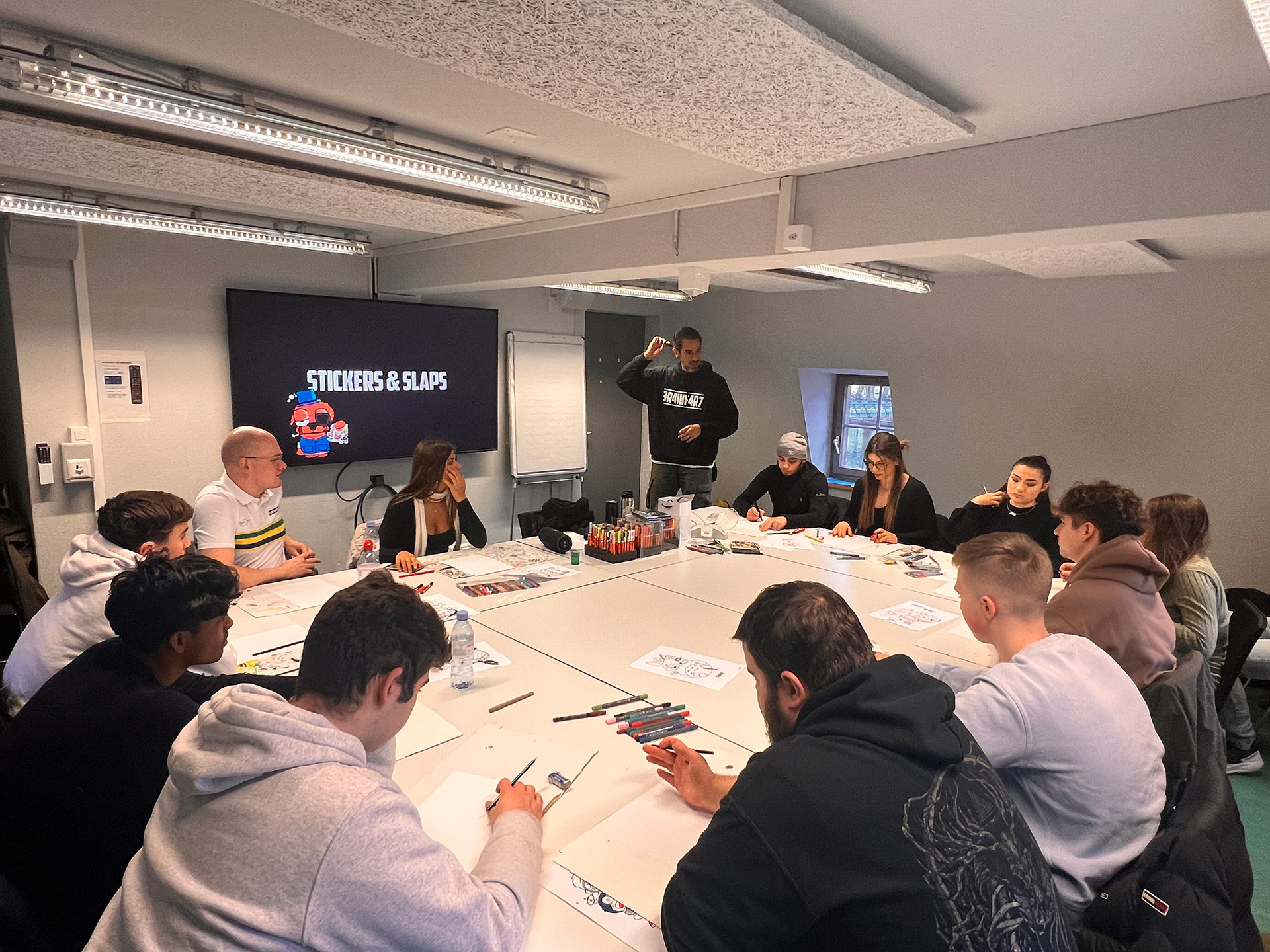 Exactly, we always try to teach both. With us, you can start with the small pearls of the city (stickers), then paste-ups, then stencils and finally freehand spraying at a legal spot. Of course, the schools/institutions have a different budget, so we have to see what we can offer with this budget, but we always try to offer the maximum so that the young people have fun.