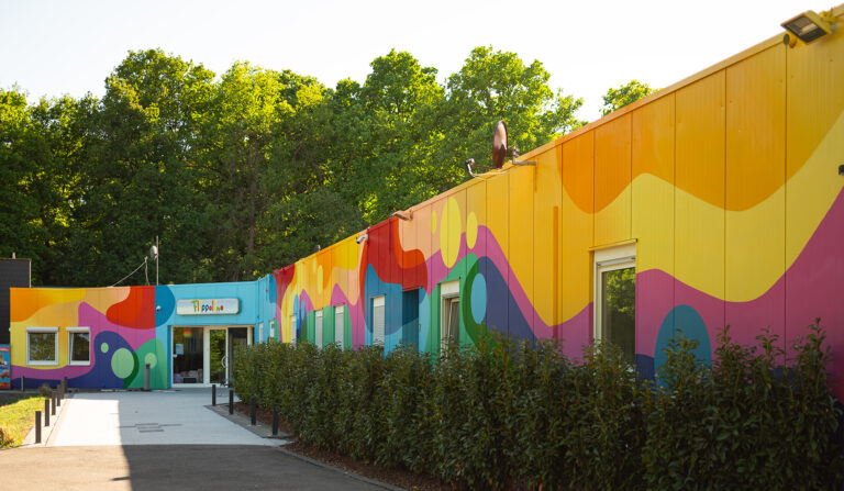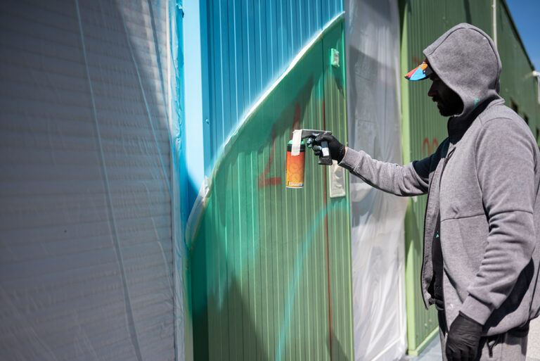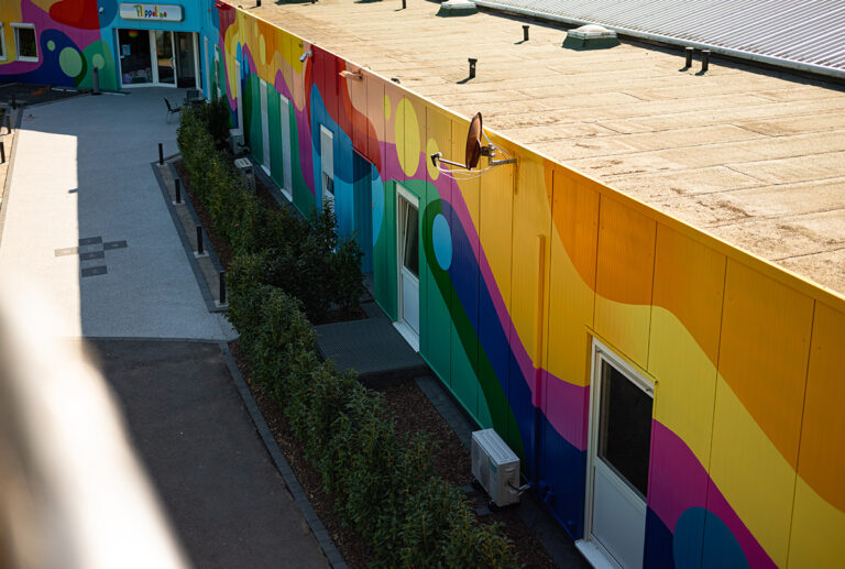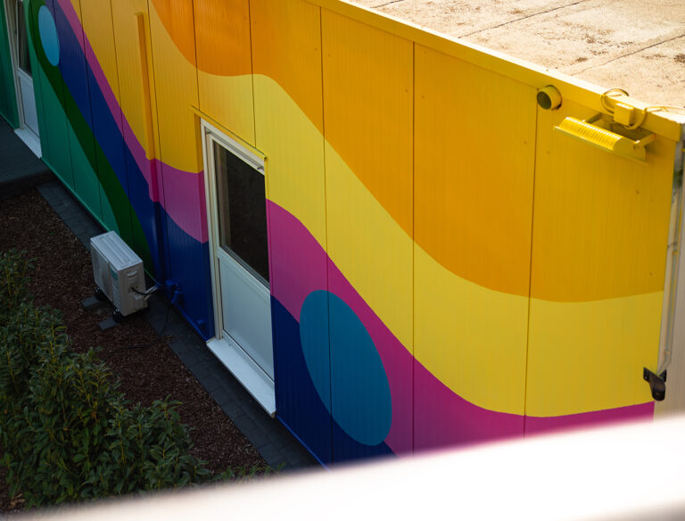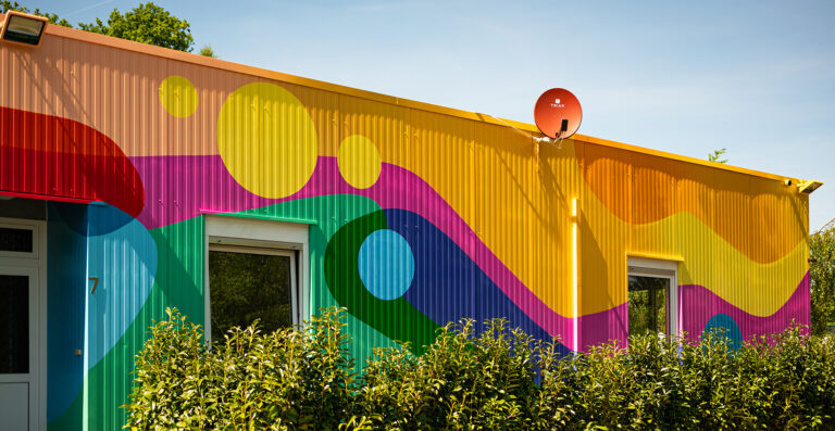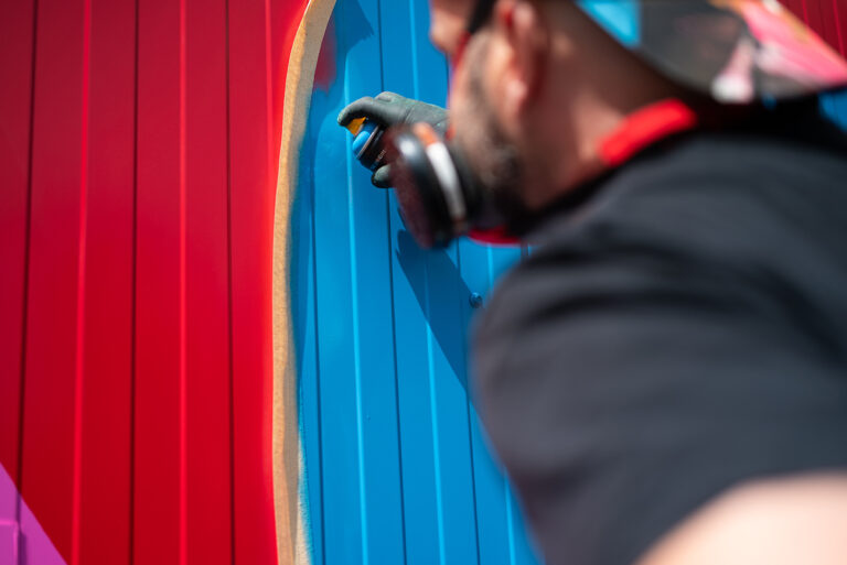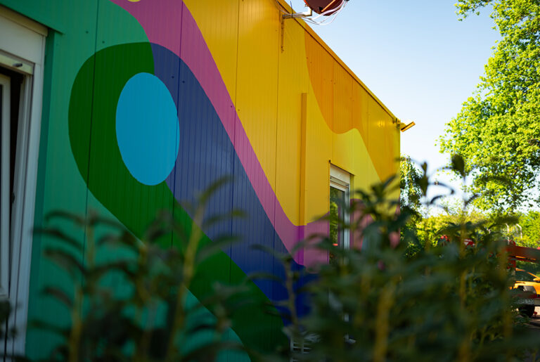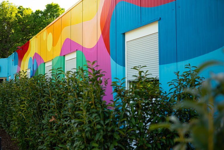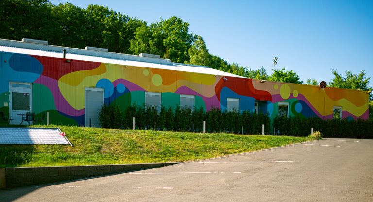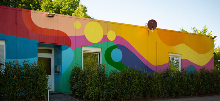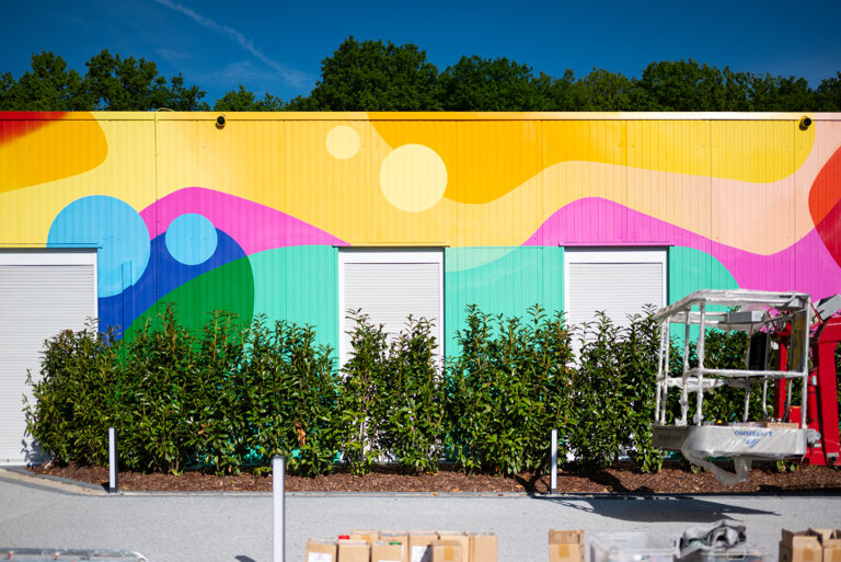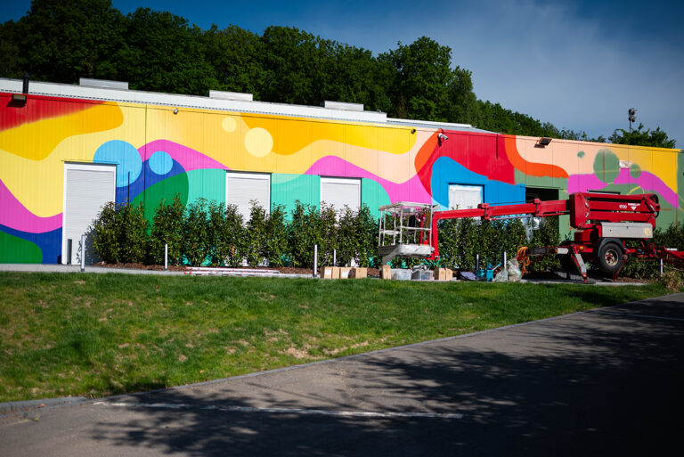 The result was a large mural featuring colorful, sweeping shapes from the MOLOTOW Premium color range! Through the use of art that appeals to children and families, the building now has a unique and inviting character even from the outside.