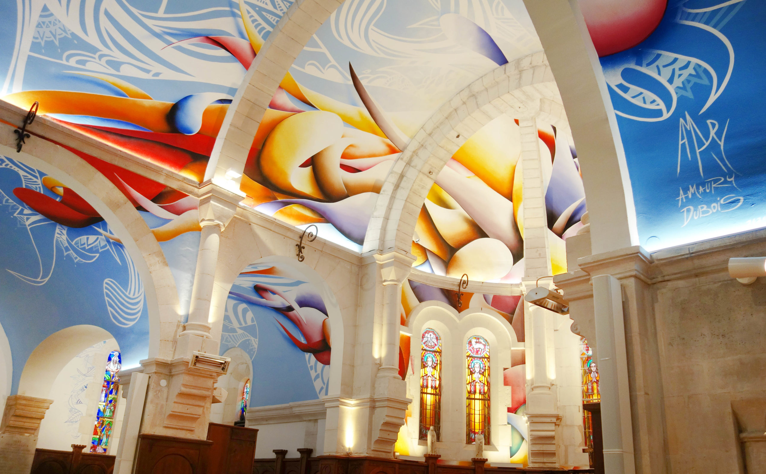 The French contemporary artist AMAURY DUBOIS painted more than 600 m2 of the Sainte-Madeleine church from the 19th century, located in the West of France.