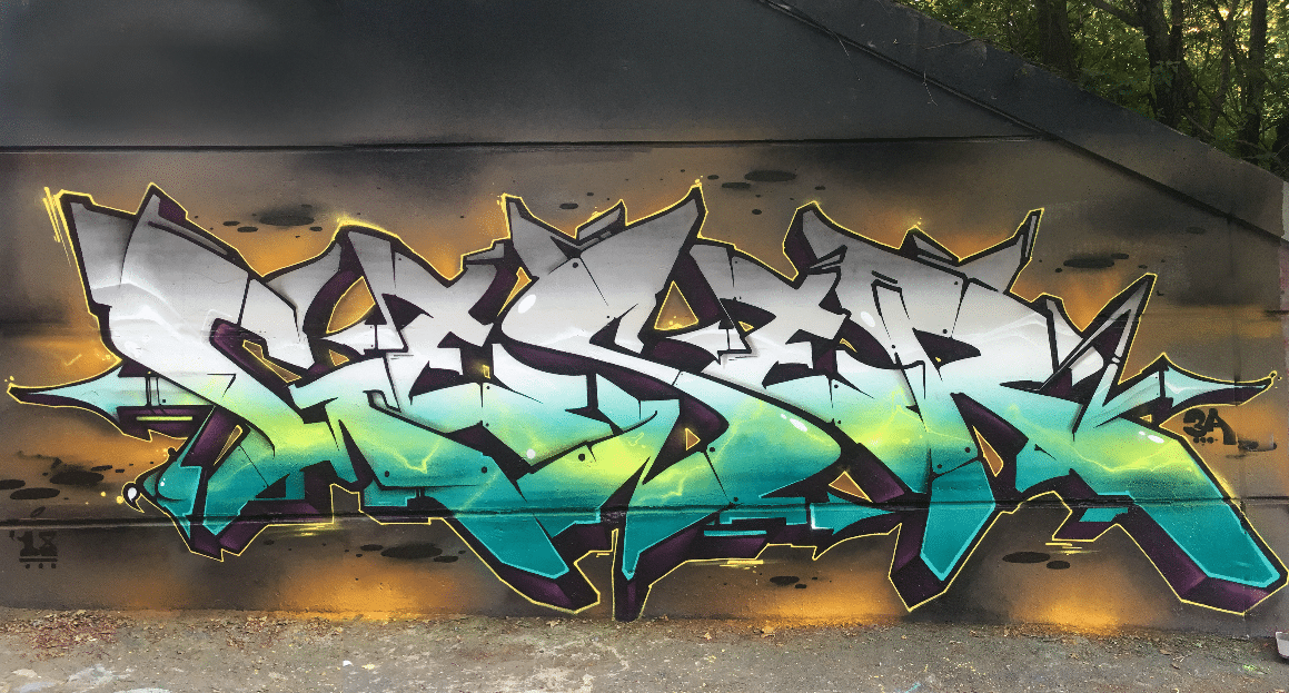 Here is a nice new classic burner by graffiti artist GESER painted with MOLOTOW PREMIUM Riviera (dark, middle, light), Signal White, Light gray Neutral, Caparso middle gray, GESER Black Red, Loomit Aubergine, Purple Violet, Espresso, Melon Yellow, Zinc Yellow and a little bit of Neon Yellow!