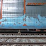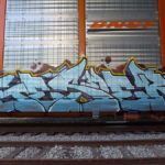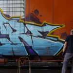 Graffiti artist GESER hits some American steel with a nice freight train panel piece painted with MOLOTOW PREMIUM Shock Blue middle & light, Slider Light Orange, Melon Yellow, Geser Black red, Grape and some FLAME BLUE black and white.