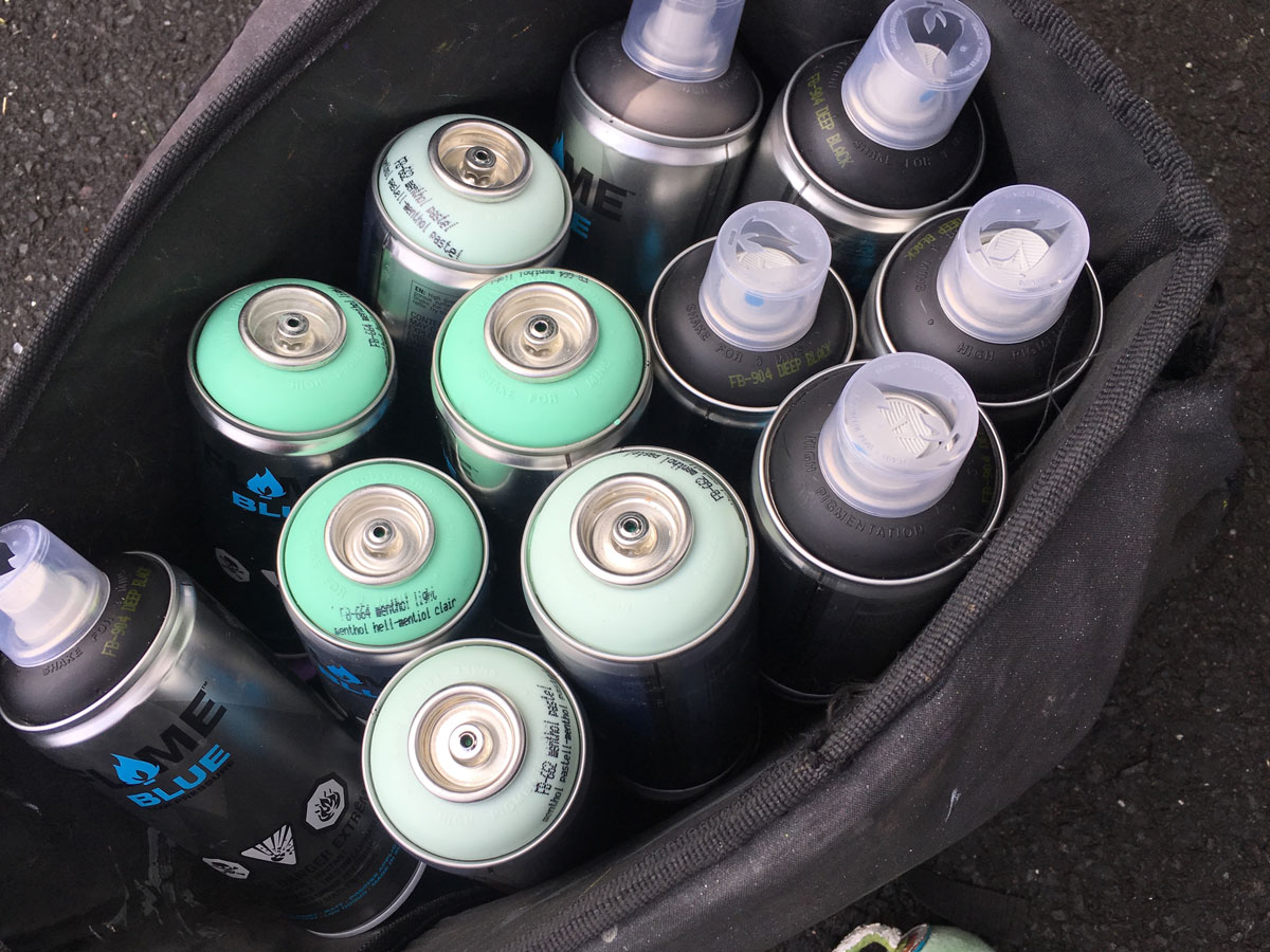 "This painting day was not ideal… the walls were soaking wet with water from start to finish, but the Flame paint stuck to the wall and stayed crisp! Some colors I used include FLAME BLUE Black, Aubergine, Traffic Purple dark, Aubergine, Camo Green, Menthol, White.."