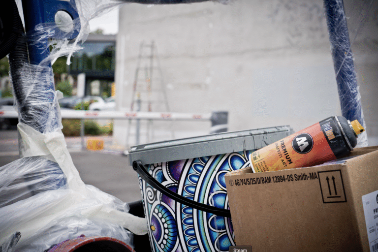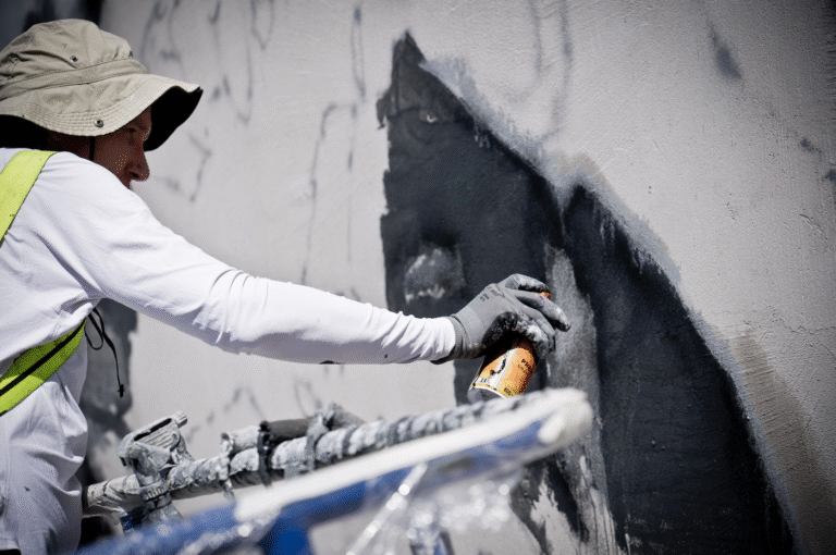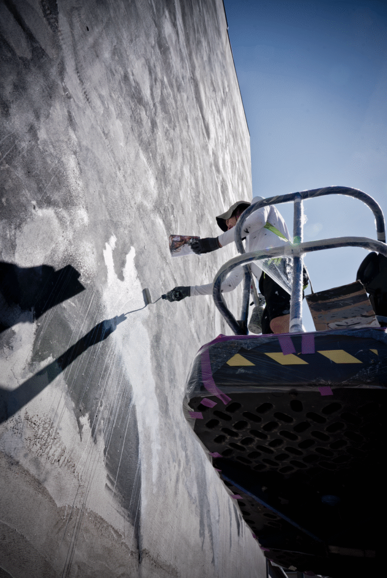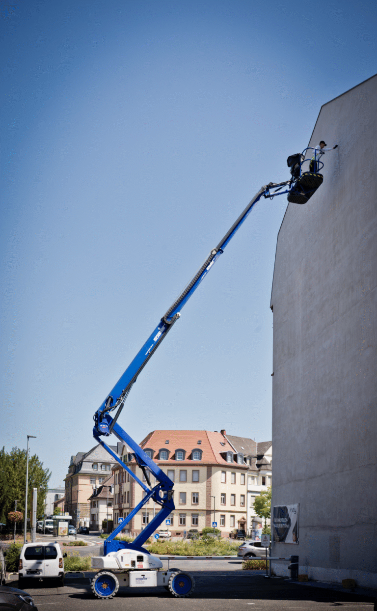 Beikirch is internationally known for his monumental facade designs. His works, which often make forgotten or unheard life stories visible, can be found not only in public spaces but also in renowned galleries worldwide. For Aschaffenburg, a local connection was desired, and the choice fell on a personality who was part of the city’s landscape for decades and yet remained a mystery: the “Plastic Man,” also known as the “Raincoat Man” or “Foil Man.”, using roller paint and MOLOTOW Premium all the way!