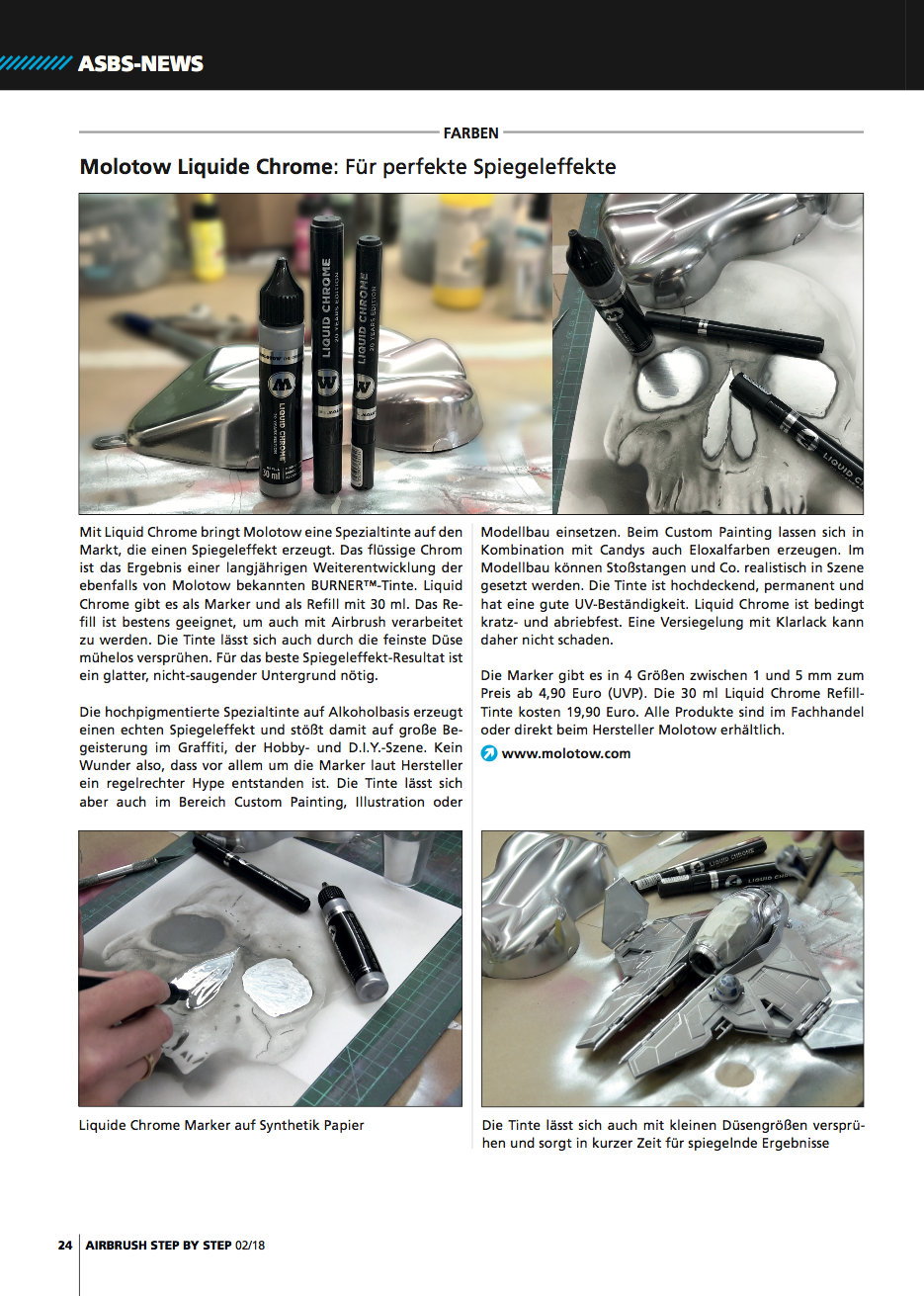 The current issue 02/2018 of the AIRBRUSH STEP BY STEP MAGAZINE features the MOLOTOW LIQUID CHROME MARKERS and REFILL in combination with the Airbrush technique. There is a tutorial video attached where you can see how the LIQUID CHROME Refill works in a Airbrush pistol and a great proof of the miror effect the alcohol based paint offers!