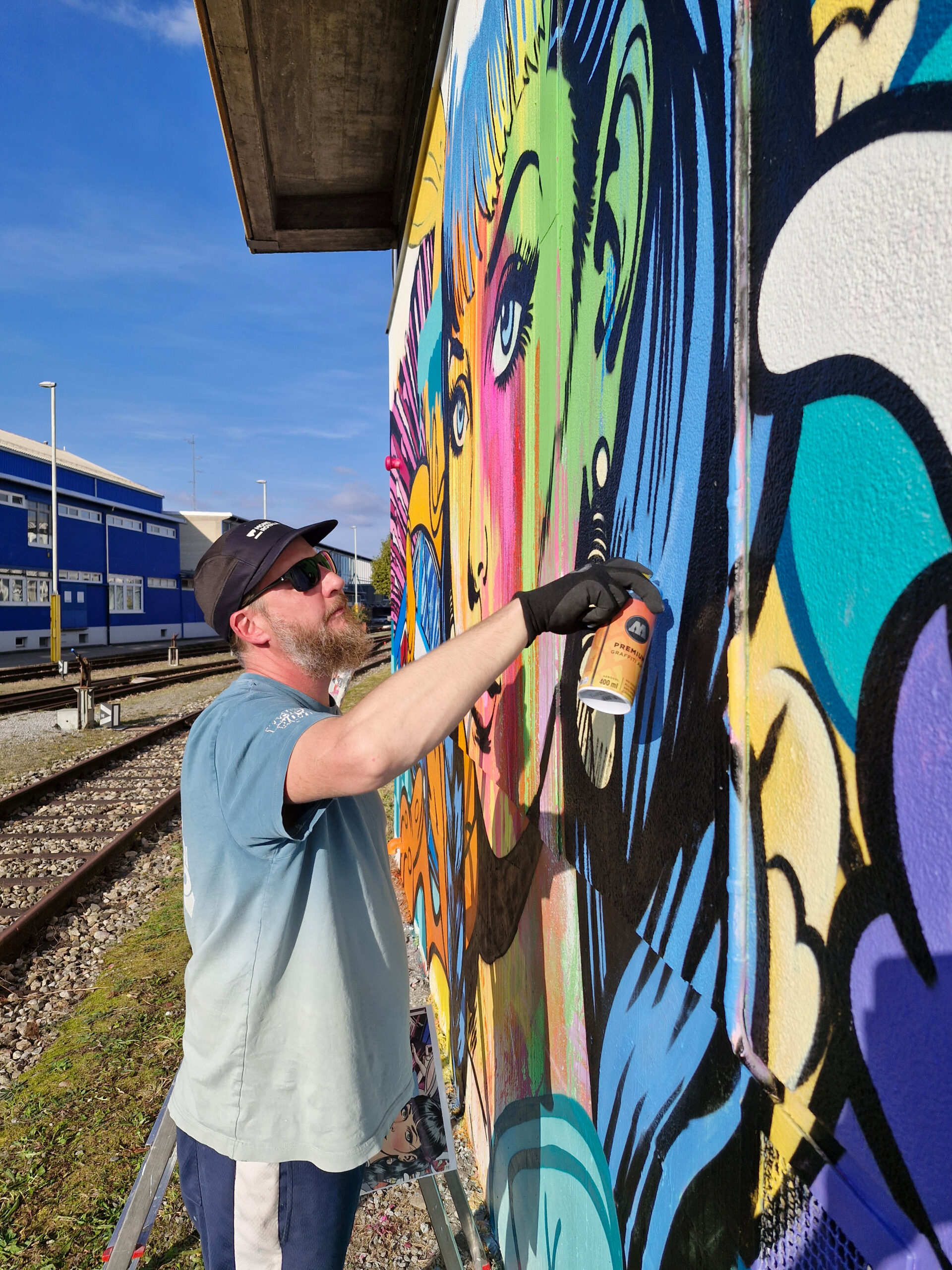 This is Graffiti artist BUST ART with a fresh new mural spraypainted with MOLOTOW Premium somewhere around the Basel (CH) tracksides!