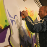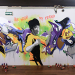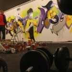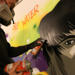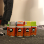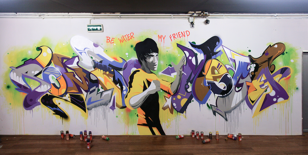 “We were invited to pimp a small gym in our hometown. They wanted an inspiring quote on the wall to use as motivation for the people who are sporting there. We decided to paint a themewall with Bruce Lee and his well known saying ‘be water my friend’…. For the background we used the MOLOTOW ONE4ALL Acrylic spray paint in combination with water and a sponge to create an overall watercolor effect. In order to achieve this we had to paint the background first after we sketched our first lines. This worked very well. We only had to wait a little bit longer before the wall was completely dry and we could start working on our pieces. From now on they have something nice to look at when sporting…”