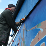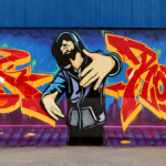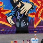 “We have always been a fan of making pieces in bright colors. A graffiti artist from Turkey (CAUSE) did make some exchange sketches for us and we liked them a lot. We decided to paint the outlines and added a cool ‘gangster’ character in the middle. The colors came out nice together with the blue rollerpainted background.”
