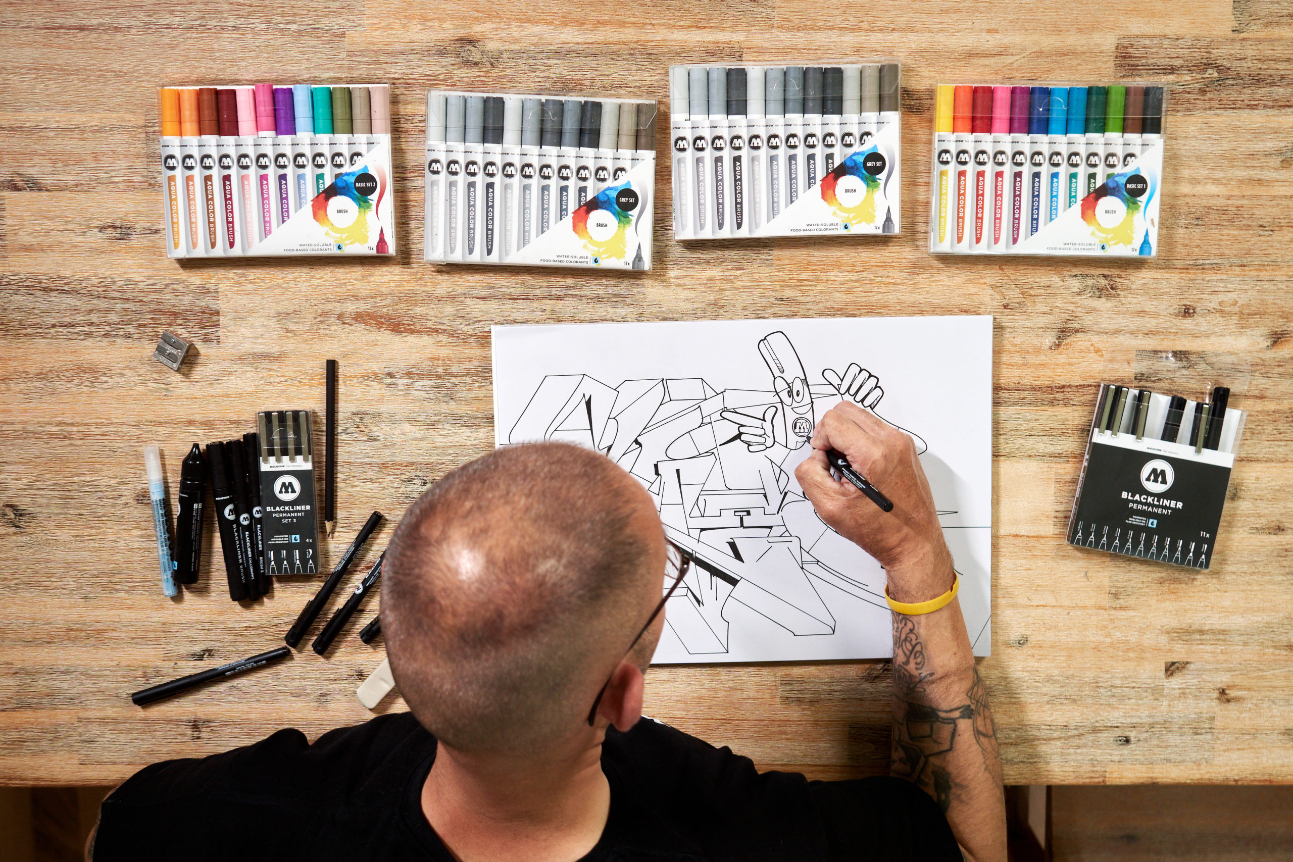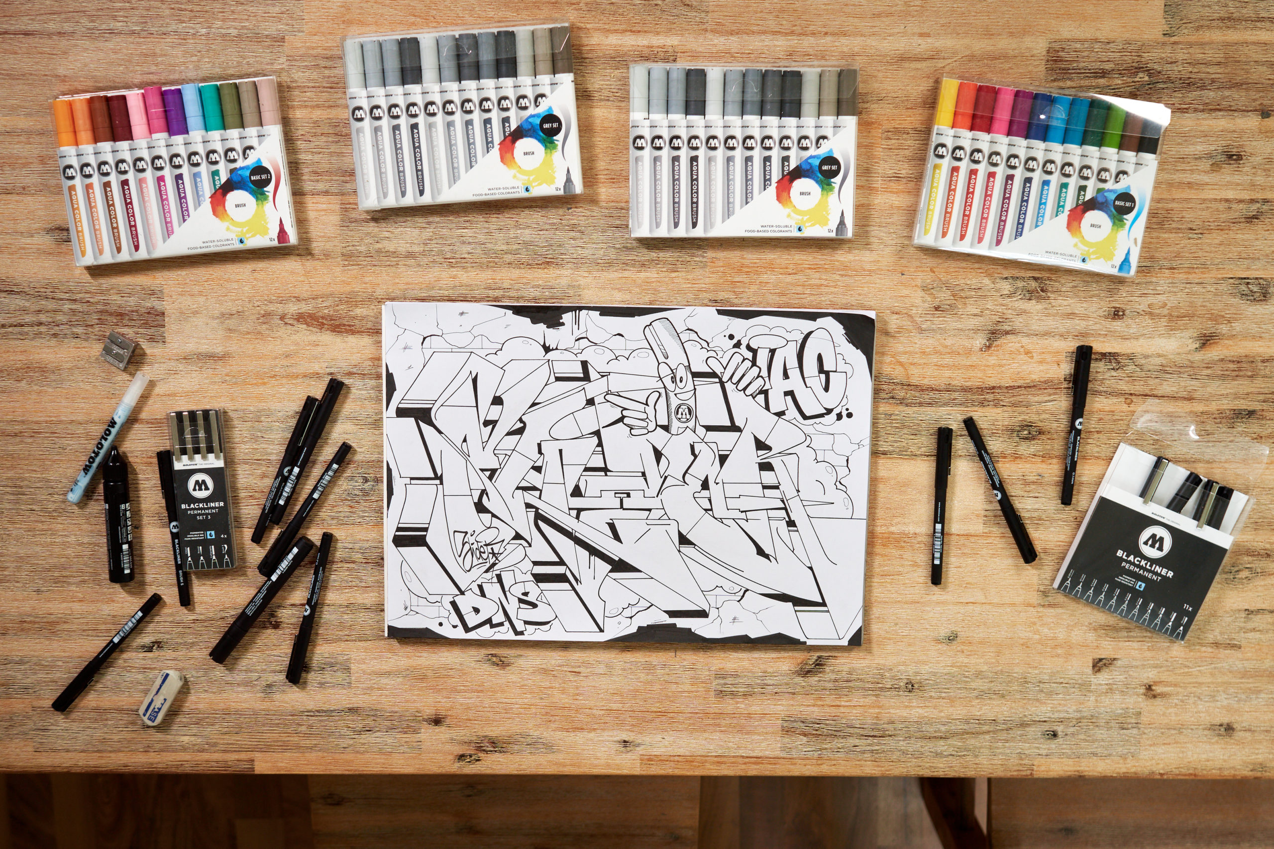 SLIDER is using the full range of the MOLOTOW Blackliners, available in stroke widths from 0,01 mm to 1 mm plus the two special tips Calligraphy and Brush S and the refillable Blackliner Brush for bigger areas.
