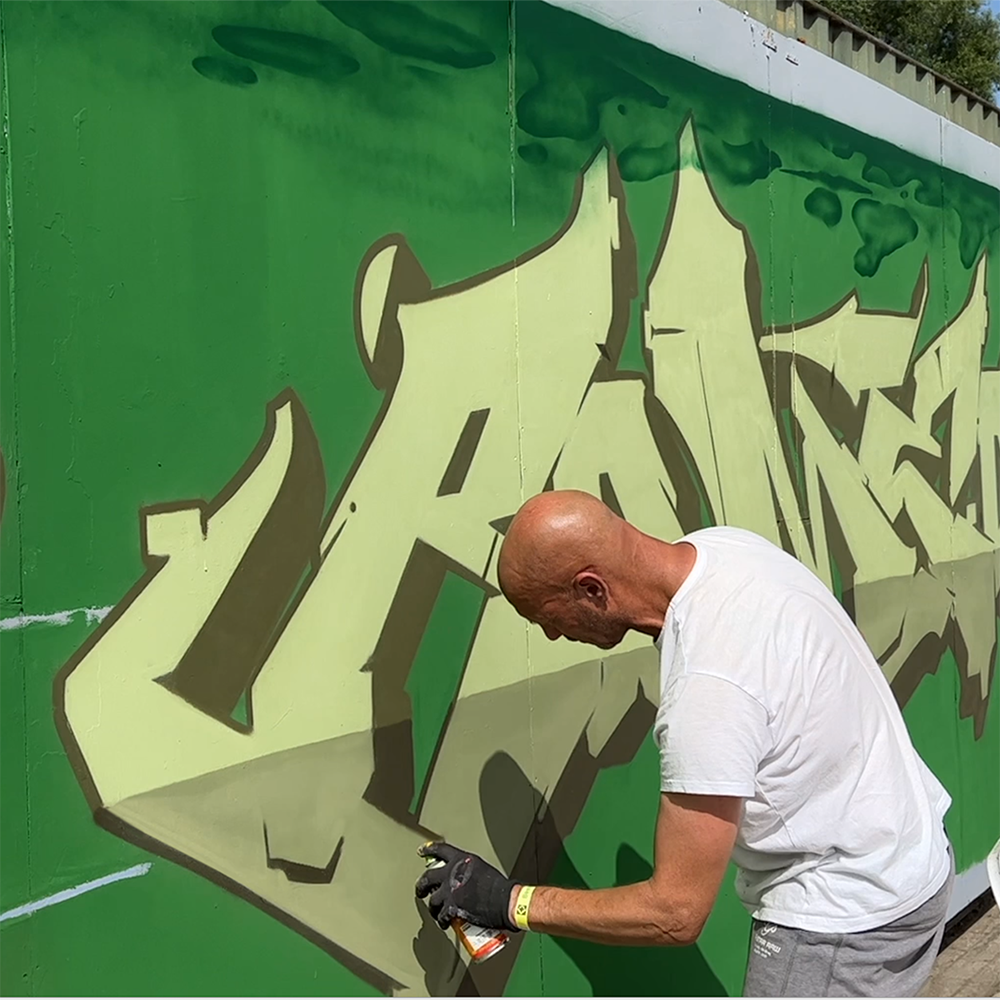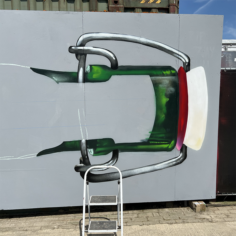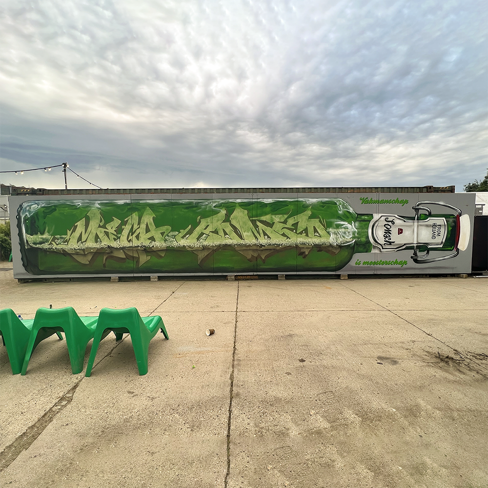 Dutch Graffiti artists Mega, Etrs and Romeo painting a graffiti production with a selection of MOLOTOW and FLAME spray paint in the style of a Grolsch swing-top beer bottle, famous in the Netherlands. The company’s slogan is ‘Vakmanschap is Meesterschap’ which translates to ‘Craftmanship is mastery’. It emphasizes the idea of being a master in one’s profession, highlighting the importance of skill and expertise.