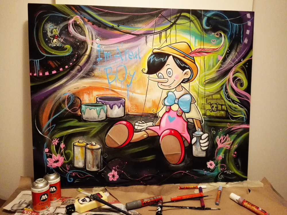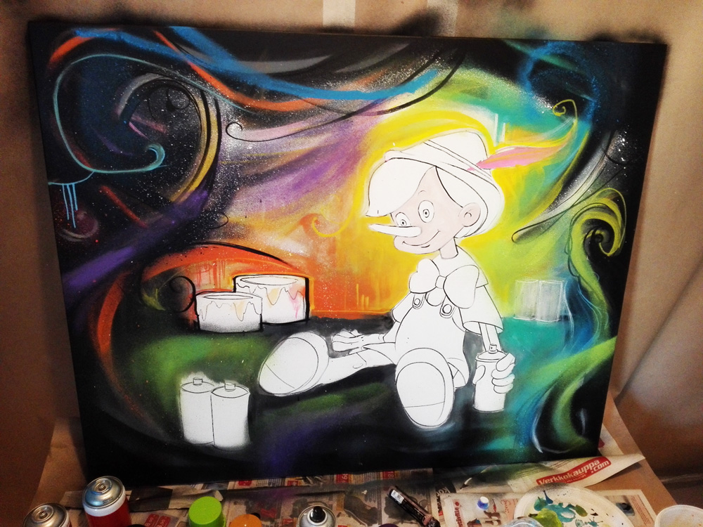 As you might know we have made a call to submit as MOLOTOW product tester, especially testing the new MOLOTOW ONE4ALL Acrylic Spraypaint in combination with the MOLOTOW ONE4ALL Markers. We received hundreds of applications and were unable to work with everyone of you for this first round. But soon coming up with a new round and call. After this one by hungarian artist Suzie here is the second one received by Nina Kuukari from Finland painting a very nice detailed Pinocchio themed canvas. We received a very good feedback from her and are happy to present such a great artwork as outcome of the first use! Jump to see the photos!