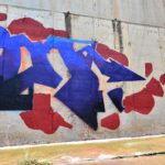 “For the piece I used the FLAME ORANGE pure white for the outlines and the F0-672 Turquoise & FO-664 Menthol Light for the 3D to make it pop. The fill-in was done with the FLAME BLUE FB-428 Cosmos blue dark, FB-426 Cosmos blue, FB-424 Cosmos blue light & FLAME ORANGE FO-904 Deep black. For the background, while choosing my colors I noticed that the FLAME BLUE Burgundy FB-320 was almost identical with a water-based latex paint I had. So I decided to use the roller paint to create shapes in the background and add details with the FLAME BLUE FB-320 Burgundy, FB-310 Piglet pink & FB-318 Traffic purple dark.”