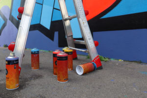 “For this “pop minimal” wall we chose a range of colors from MOLOTOW premium: -shock blue light, shock blue middle, shock blue, antistatik neon red pour the filling -golden yellow, kiwi pastel, light violet, strawberry red, raspberry red for the background -and neon pink from FLAME PAINT”