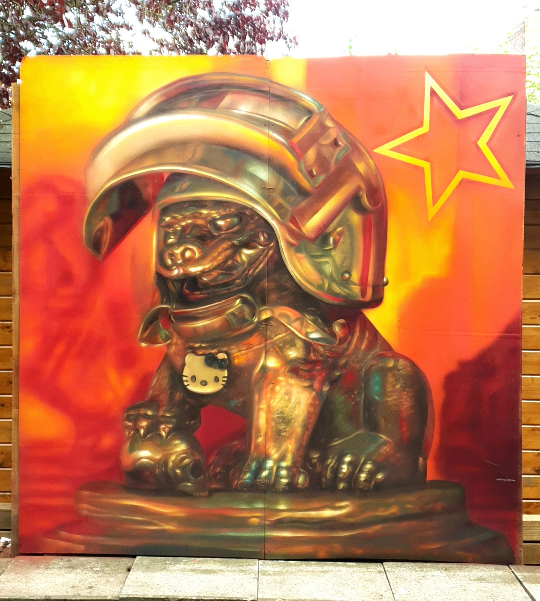British graffiti artist REPLETE continues his Neon Classical series with this piece entitled “Pussy Riot” featuring a Chinese Lion guardian wearing a riot helmet. Painted with over 50 tones of MOLOTOW PREMIUM and URBAN FINE ART metallic gold. Check out the photos below!
