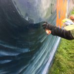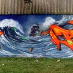 The weather gods were not on our side that day since it was raining heavily most of the time but we succeeded in leaving a nice wall at the end of the day. The background was painted by Etrs. He used the Petrol and Deep-sea blue colors on top of the rollerpaint color to create the waves. Together with some greys, whites and dirty greens he created the whole background.
