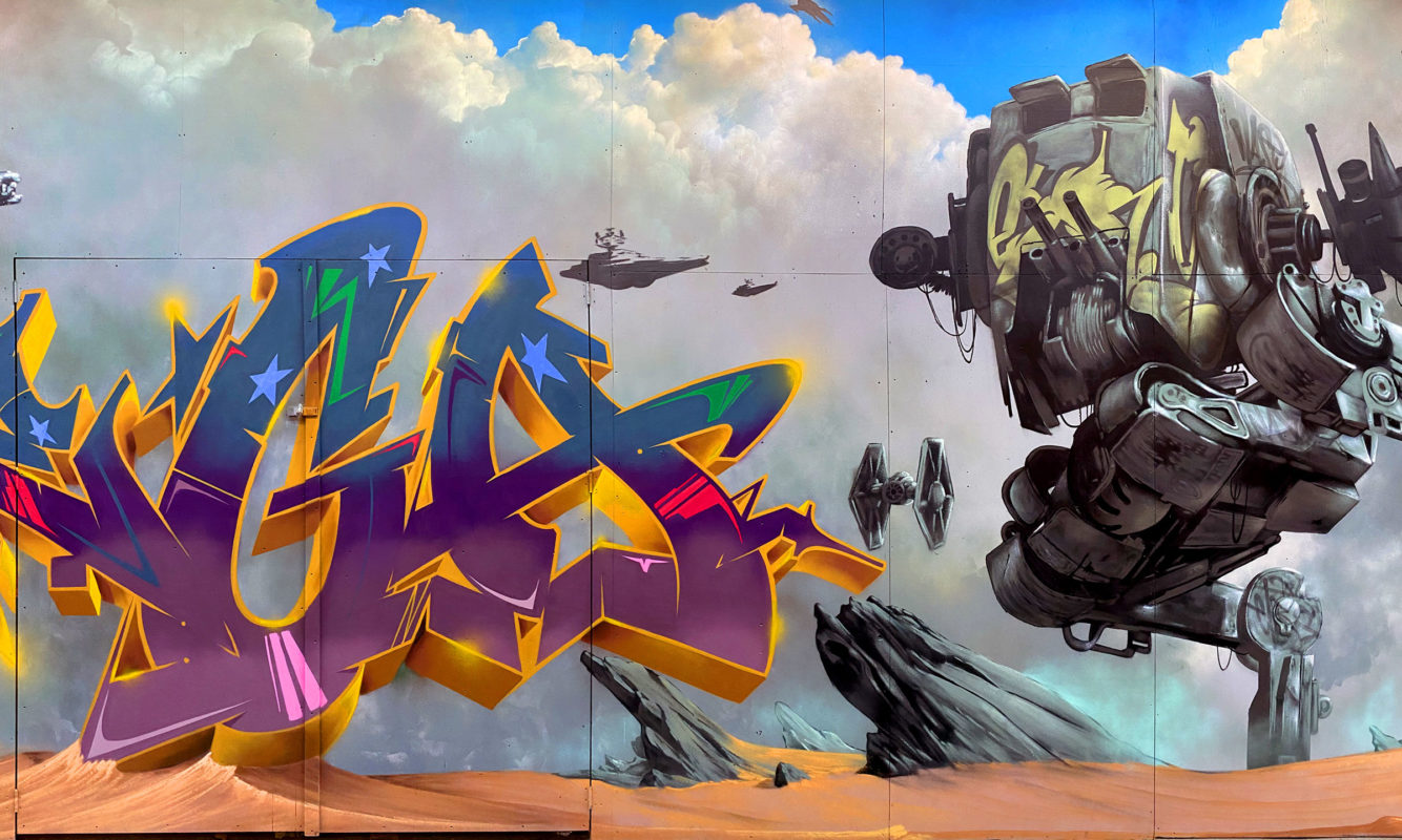 During the Covid 19 lockdown in the netherlands graffiti artists ROMEO, MEGA and ETRS tried to make the best of it and took their time to work for some days on a highly detailed wall with a Star Wars theme. They painted this big wall with MOLOTOW™ Premium and some FLAME™ BLUE cans!