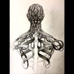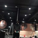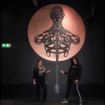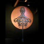"This was a really cool challenge, a totally black consert hall, with a white transparent bar and copper lampshades. As the name of the scene is the "bassGarage", the design to me was obvious. The decoration fit perfect with my spiral figures that is very much related to music. They evolved in a process some years ago in the study of rythms in the human figure.