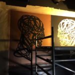 I chose to make this with stencils first, because of the style and the details of the design. They were placed directly on the black wall and sprayed with Burner Copper to make the background. I used the smoothsoft white/blue caps on the Burner Copper to make less dust and to have more control on the outline. Wich worked out really good.
