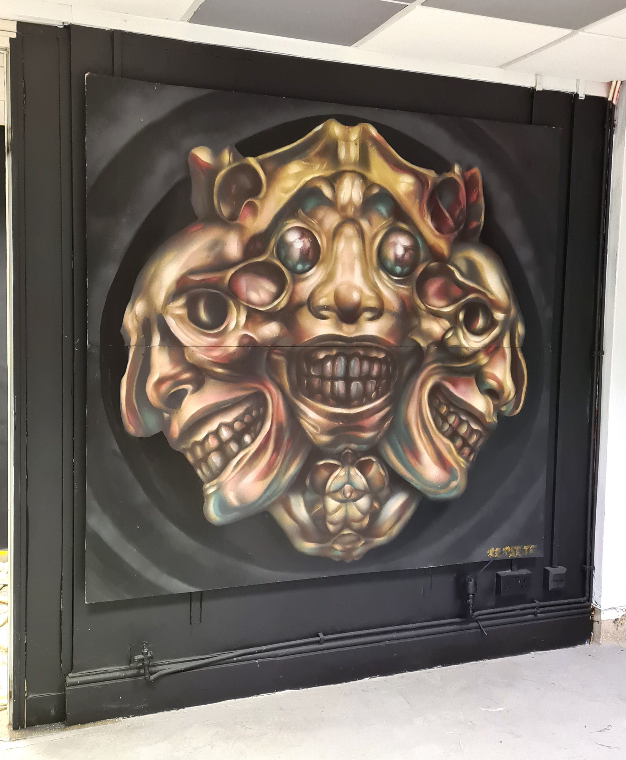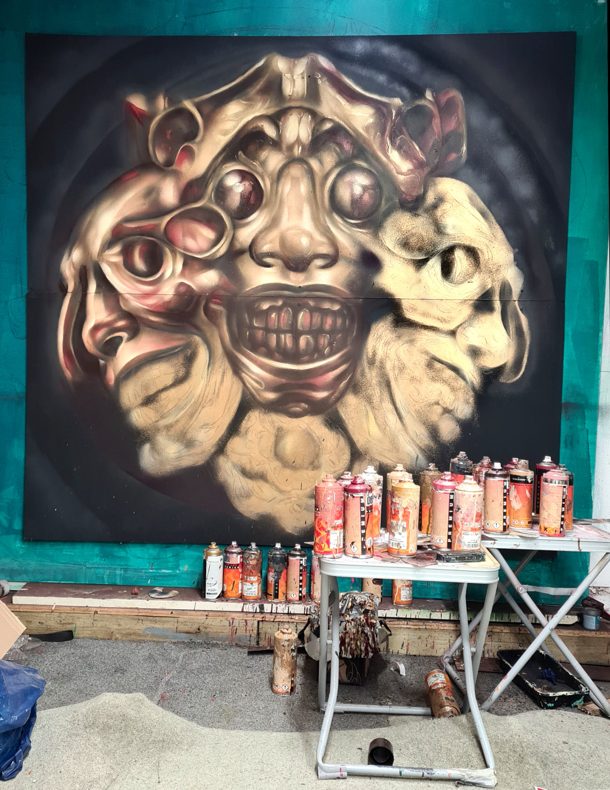 UK graffiti artist REPLETE is back with one great recently painted piece of a three headed bronze demon created with MOLOTOW metallic gold and 40 tones of MOLOTOW Premium. It’s featured in a group show by Bomb Squad with artists such as Part2, Soda, Inkie and Burning Candy and others to raise funds for SASH, a homeless charity in the UK.