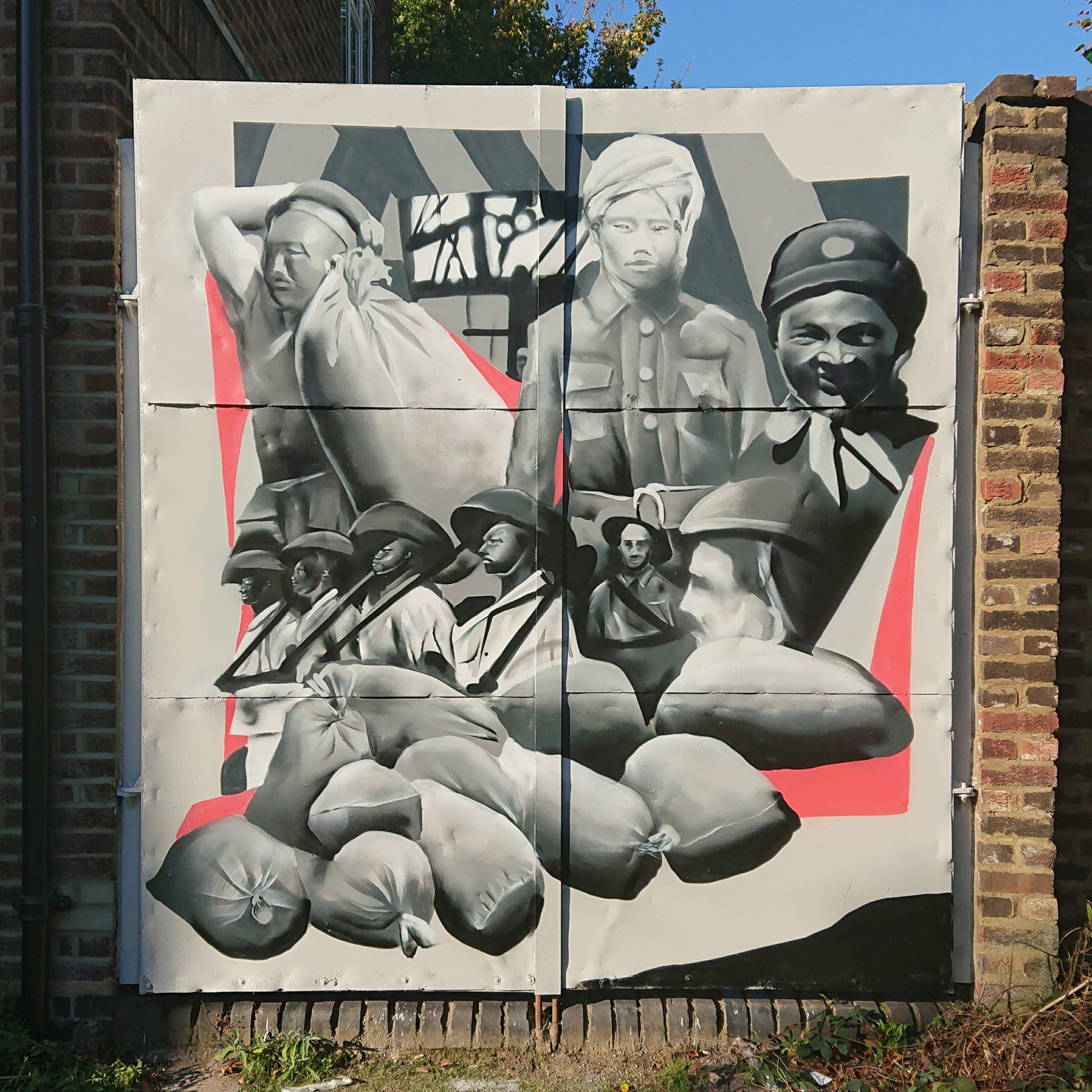 This is one of a recently painted public mural curated by TRAPPEND IN ZONE ONE. The Mural is located in Tower Hamlets (London) to mark the centenary year since the end of the First World War. The theme of the mural painted by the artist Curtis Hylton is around the Labour Corps who served in the Great War honouring their brave sacrifice by featuring a diverse group of nationalities that were part of the regiment from Africa, China, India and Great Britain as a remembrance for their heroic contribution in WW1 in their hand painted mural using MOLOTOW PREMIUM spray paint!